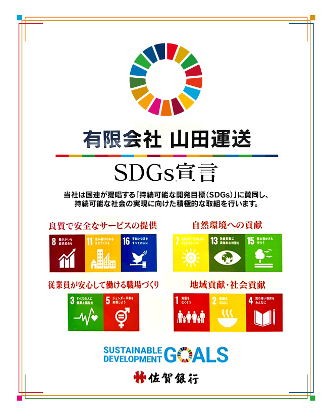 有限会社 山田運輸は佐賀銀行の「さぎんSDGs取組支援・宣言サポートサービス」を活用して宣言書を発行しました。